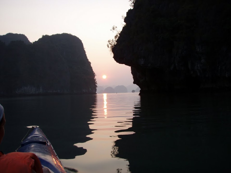 Finally we arrived at a floating village where we could hire kayaks and head off closer to the islands. In one, a small tunnel led to an inner lake which was all very pretty. Whilst the others went for a closer look at some rocks we nipped back to the ship and had a couple of cans of beer lowered down, then rejoined the others to gloat.