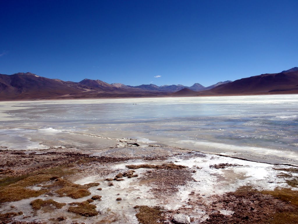 The scenic route to Uyuni takes in a number of natural landmarks. First up were four lakes; a white lake, coloured by Borax and Calcium; a green lake, reeking of sulphur and arsenic and a blue lake directly over a volcano, and the site of a hot springs where we could bathe.
