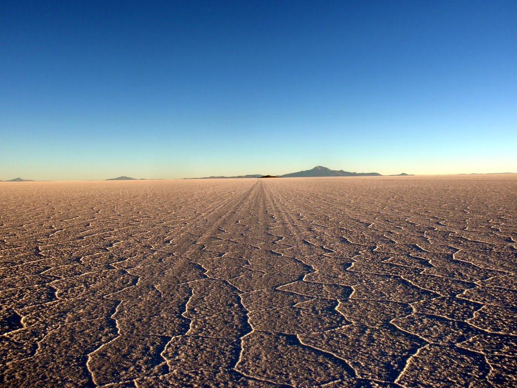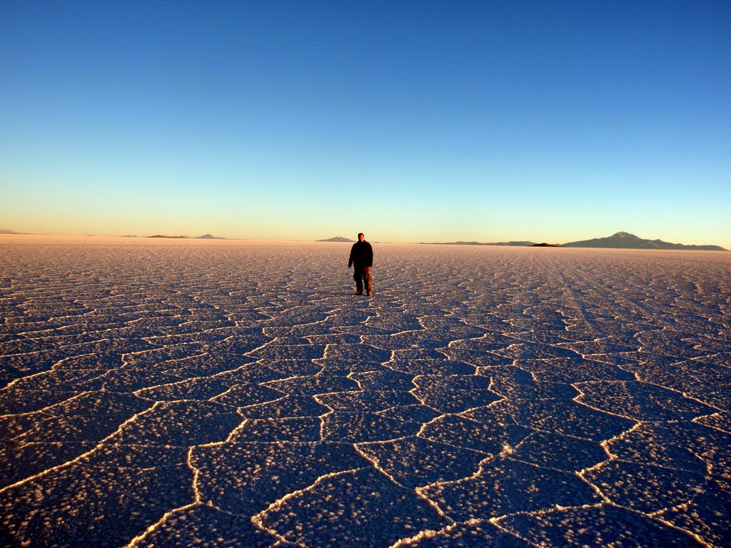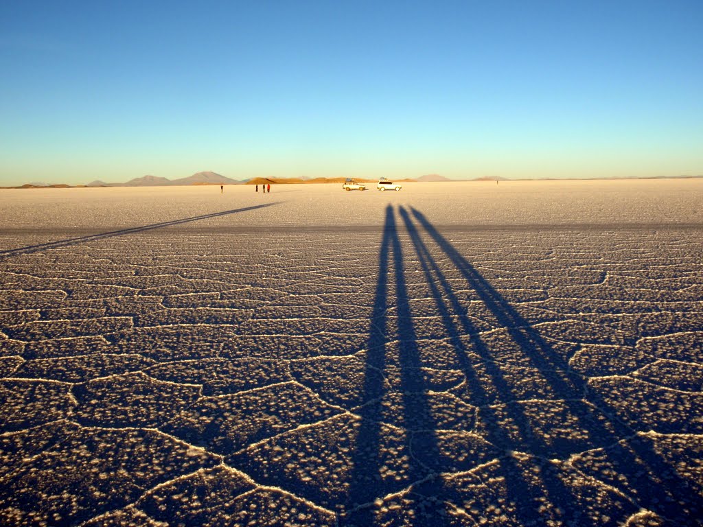 Further on we reached the remnants of the last lake. The Salt Flats were formed by 11 lakes drying out on top of each other. It’s now 12000km square and 27m deep. At the lake it’s possible to reach through the crust into the water a few inches below and grab lithium crystals. Similar to Chile these are expected to become a major source of income for Bolivia when sold for use in rechargeable batteries, but when open cast mining starts it’s likely to be the end of the salt flats.