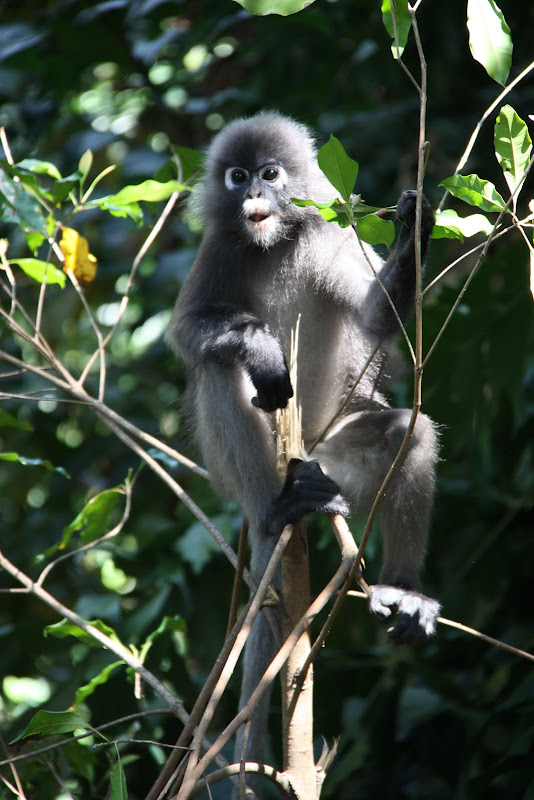 Following a warning about mosquitoes we stood at the back applied repellent whilst all the seated people sprayed DEET over themselves and in the faces of whoever happened to be sitting nearby. We were then led on a mile long trek uphill to the boundary with the reserve where the orangutans were nowhere to be seen, but a troupe of monkeys waited expectantly.