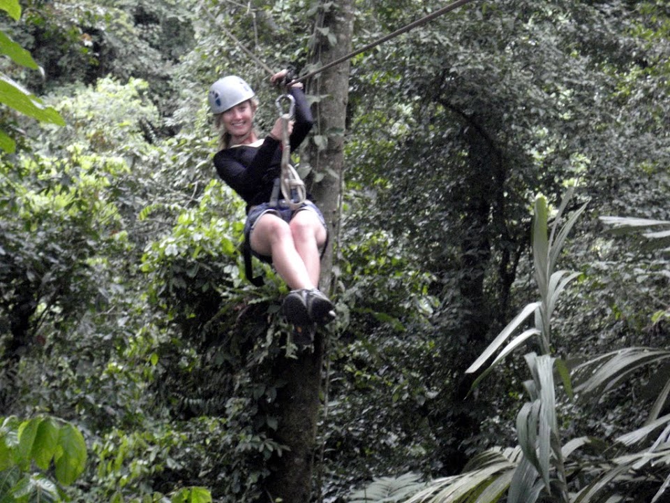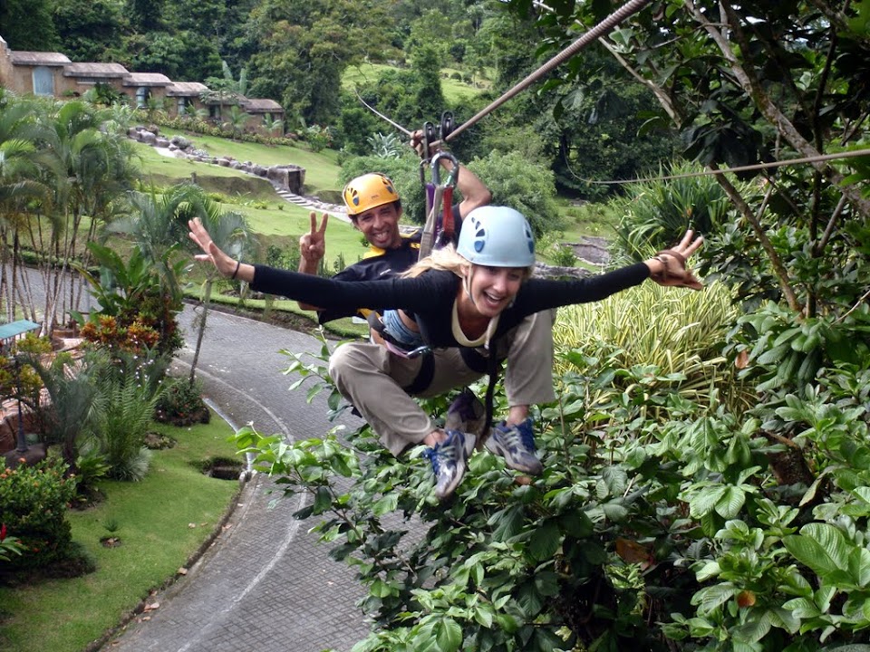 A canopy tour is a series of zip wires, or death slides depending on your point of view, passing from treetop to treetop. There are a number to choose from, the longest being 150m off the ground and just short of 1km long. You’re tooled up with a harness, a pulley and a braking glove -a loose fitting leather pad that you use to slow yourself before hitting a tree. After a long safety briefing you get a quick practical lesson before setting off around the rainforest at speeds of up to 70km per hour.  You can be strapped in by the traditional hanging on for dear life style, go upside down or be strapped in between the instructor’s legs to go superman style. Obviously the instructors are much keener to get the girls to go in the superman style, so I stuck to the faster hanging style and one go at inverted, which was just plain wrong.