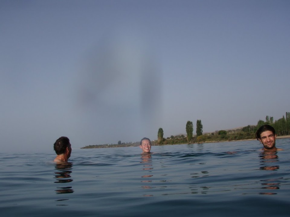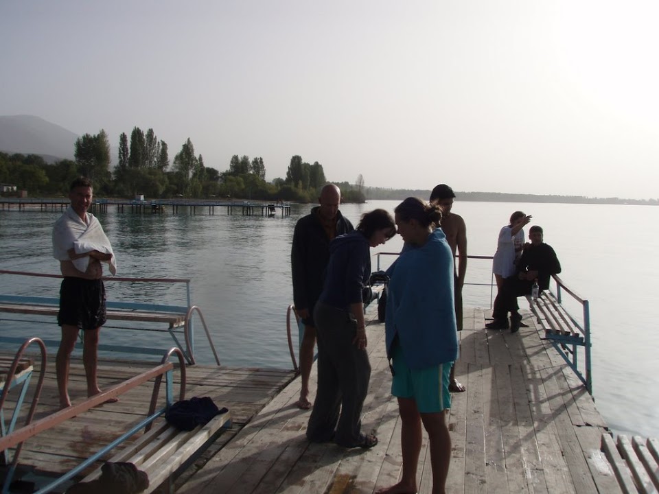 After a night spent in the local Sanitorium being scrubbed to within an inch of our lives, we got up in the morning for a swim in the Issyk Kul lake, which translates as ‘The Warm Lake’. This just isn’t true at 6 in the morning, although the random skinny-dipping lady handing out vodka shots was much appreciated.