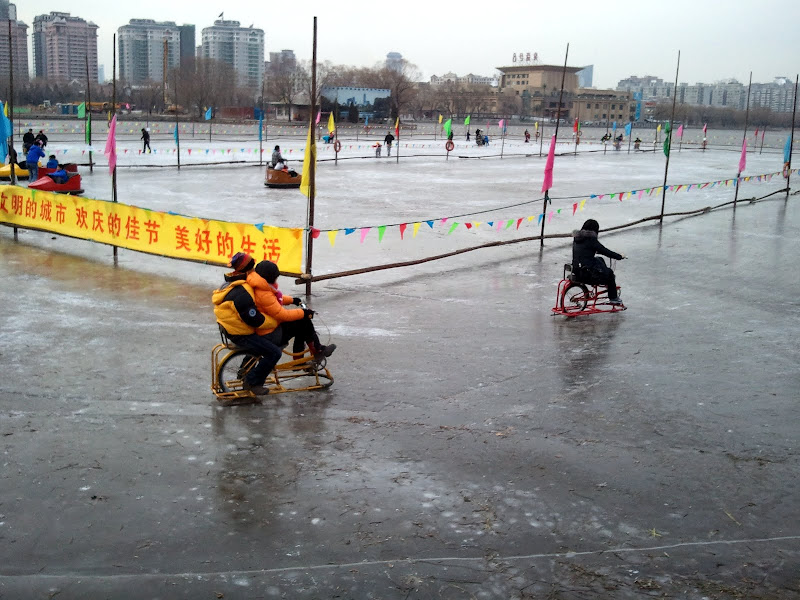 Beijingers don’t seem to let the cold slow them down and quite happily wrap up to enjoy alternative versions of what the city usually has to offer during the warm summer months. An example would be Chaoyang Park – normally a busy theme park, complete with rollercoasters and ghost trains, at this time of year it becomes a snow park. The dodgems are now human powered and slide around the frozen lake whilst smaller children weave amongst them on ice-bikes and even ice-tandems.