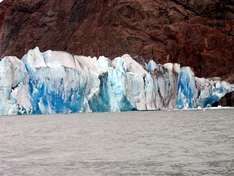 Only being there for two days we arranged a boat trip to go hiking on the local blue glacier. Rather than falling from the glacier face, the ice here mainly comes out from under the bottom of the glacier, producing bright blue icebergs*. It’s therefore worthwhile docking at the foot of the glacier, strapping on crampons and hiking up into the resulting ice caves. Our boat got close to the glacier but the lake was too rough to be able to dock so they rescheduled us for the following day.
