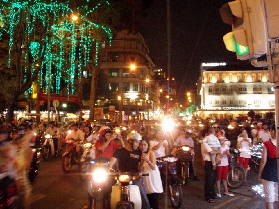 Back on the bus and made it to the hotel in Saigon, which turned out to be located just off the opera square, in the equivalent of Bond Street in London or 5th Avenue in New York. Having dropped off the luggage we wandered round Gucci in dusty Tunnel Rat clothes, got changed into respectable enough clothes to book a table for Christmas dinner at the Sheraton. We then retired to the upstairs bar of the Caravel Hotel and took in the main square. This bar turned out to be called ‘Saigon, Saigon’, where a couple of American journalists invented the B-52 cocktail. We felt oblighed to try one and immediately a Vietnamese Santa and his elves in miniskirts appeared and gave us a hug – remarkable drink.