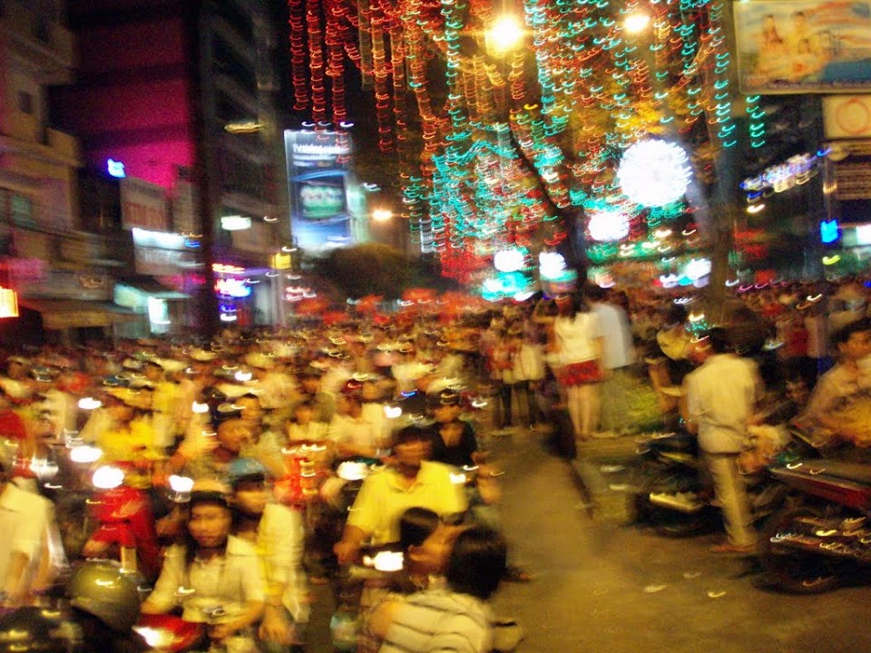After the 3rd shower of the day headed out to support Vietnam in the football against the champions of the last 3 years, and old enemy, Thailand. After a tense match the underdogs won 2-1 and suddenly the streets erupted with thousands of people and motorbikes, all cheering and heading for the centre of town. We strode along the main street with a huge Vietnamese flag and got cheered and waved at all the way, eventually getting separated as most of the girls stayed on the pavement whilst Nicky mounted my shoulders and we strode into the mayhem, instantly becoming celebrities as the tallest combined person there by about 4 feet. The football fans pelted us with silly string, spray snow and handfuls of glitter, so we emerged looking like badly decorated Christmas trees.