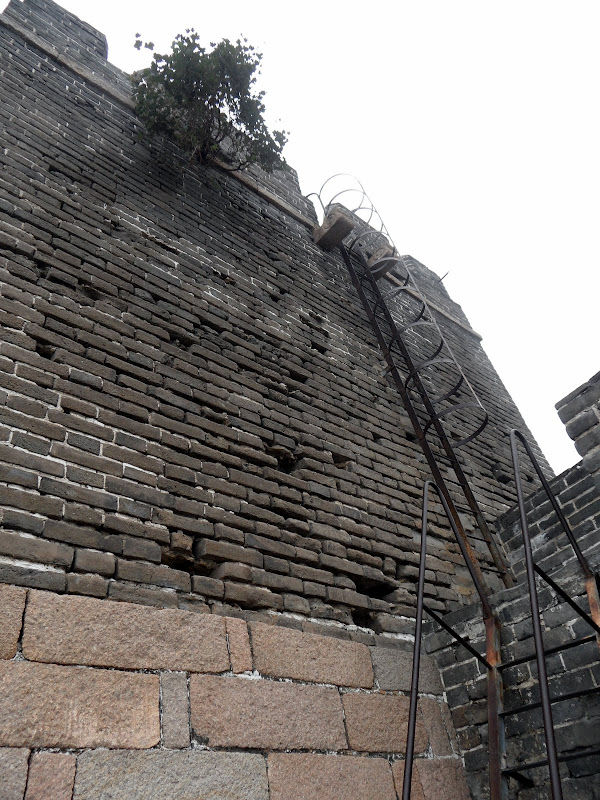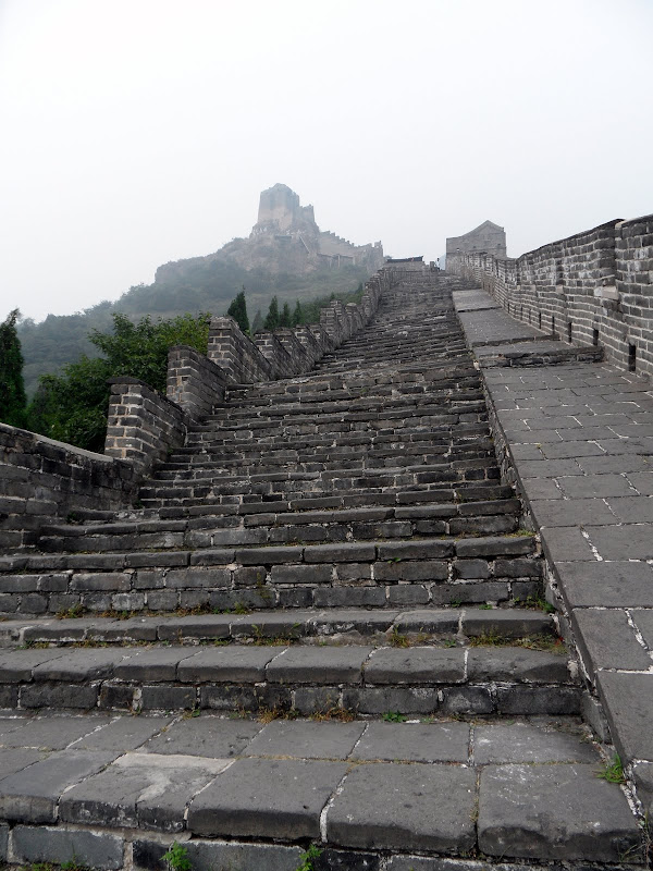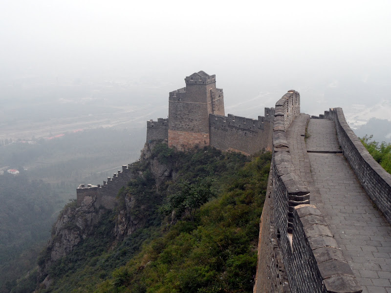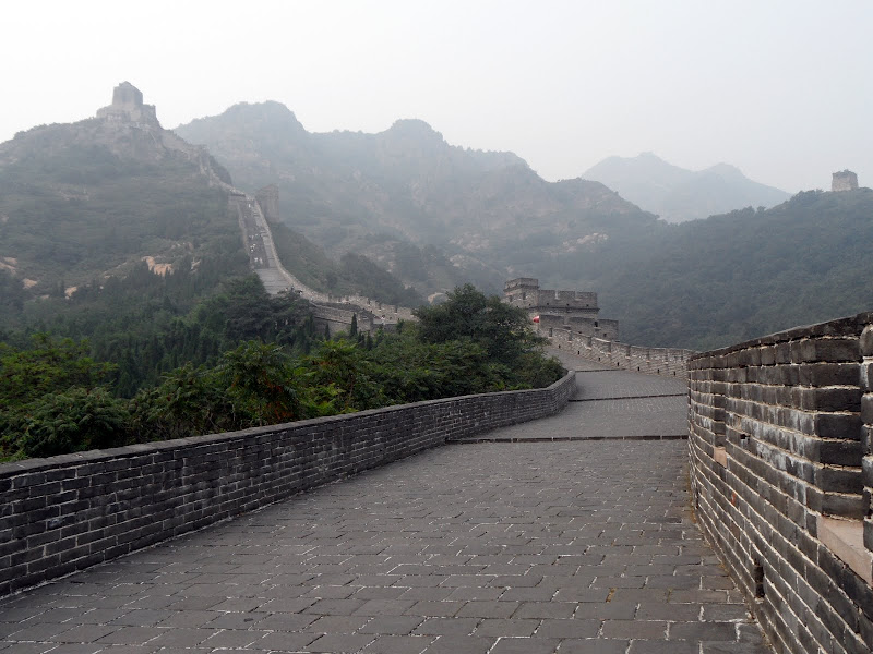 Walking down from the peak may well have been just as hard as walking up. The stones are smooth and slippery, and the steps fall up to half a meter. The wall is up to 10 meters high and 5 meters wide, punctuated by the occasional guard tower. These pose serious problems in passing along the wall as they can only be reached by ladders, so it’s necessary to climb up and down a few meters each time – not great with a backpack, probably worse with a spear and shield. As you get lower the wall becomes wider and smoother, with a serious lean to the left. Being just before the October holidays, when the whole country gets 10 days off, the wall and park were nearly empty so thankfully we could struggle along in peace.