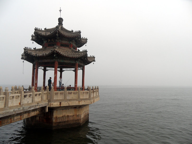 Climbing onto the Great Wall it’s possible to walk to the very end, where the wall meets the sea. Previously used to keep out the invaders from the north, it’s now a popular fishing spot. Curving away from the wall is a sandy beach which leads round to a temple honouring the sea god, which also extends a considerable distance out over the water.