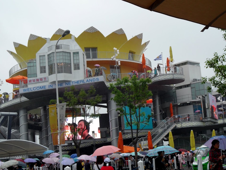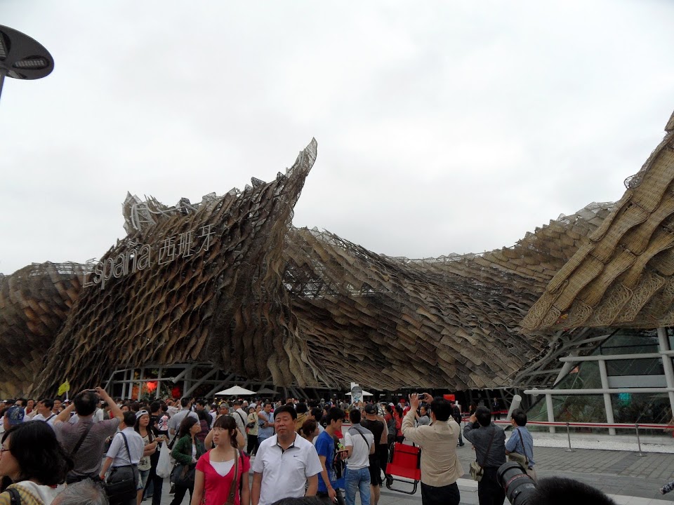 [wp_geo_map]The centrepiece of the whole expo is the Chinese pavilion: at 68m high and $220m the largest and most expensive in history, and also the hardest to get into. People queue from 7am, 2 hours before the actual opening time, in the hope of getting a 15 minute time slot. We didn’t arrive until midday, so didn’t even bother trying. Reports in the media suggest queues of up to 6 hours are not uncommon for the most popular pavilions so we opted to just wander round the site and enjoy the impressive architecture of the pavilions. This should have been straightforward enough, but the pushing and shoving of the huge crowds was less than enjoyable, and when it started raining and the umbrellas all came out at my eye height we gave up and found a place to wait it out in the dry.