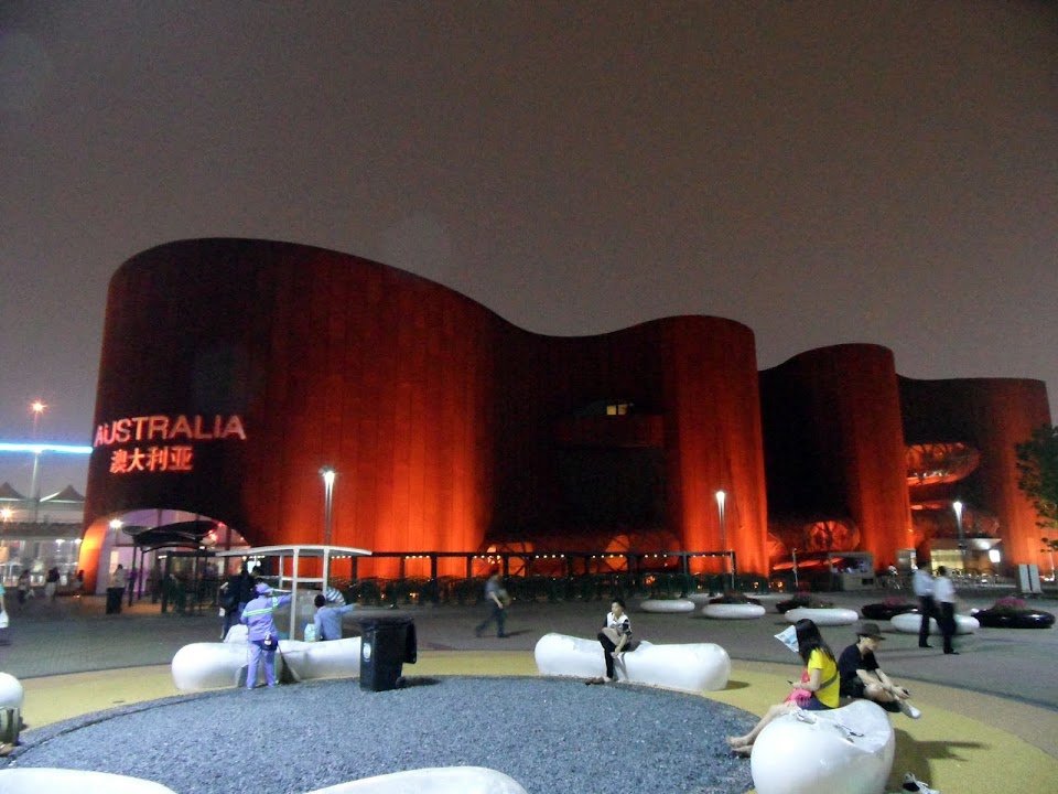 About ready to leave we passed the Indochina square and dropped into Sri Lanka and Pakistan. By the time we emerged the lights were already out in the rest of the pavilions, so we headed towards the gates. The last pavilion before the gates is the Australia pavilion, still with Aussies outside and letting people in. They were the last pavilion open on the night and kept shouting how they were the hardest working pavilion in the show. The pavilion itself is made of weathered steel, left to oxidise and turn a deep ochre colour, reminiscent of Uluru, or Ayer’s Rock as it used to be known.