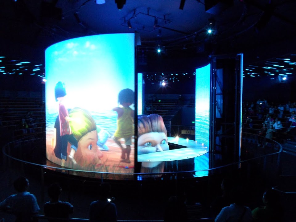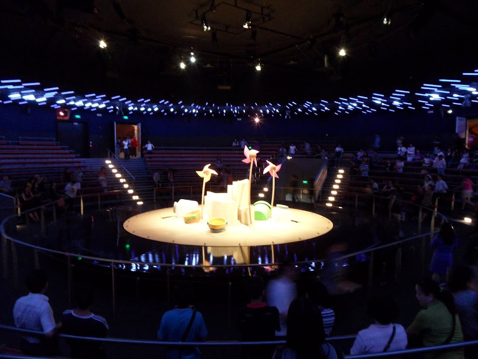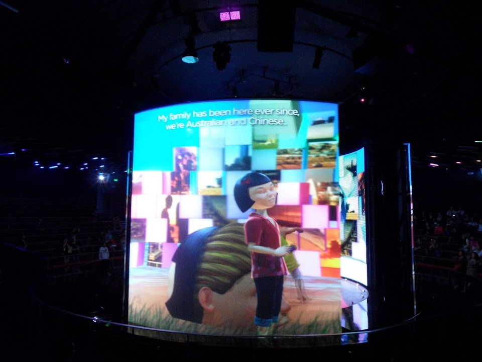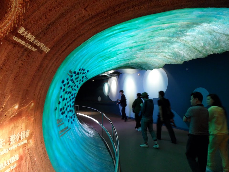 Inside a large spiral path shows you the history of Australia, and its relationship with China, their largest trading partner. Further up the three storey building is an overview of the natural beauty of Australia and a single panel on Women’s Rights which looks like an afterthought. At the top you’re led into the centrepiece, a large 360 degree auditorium where you’re shown an animated video on a cylindrical screen whilst the stage in the centre gets redressed. The high quality animation features a Chinese girl and Australian boy musing on the joys of leaving the country behind and moving to the big city, which whilst in keeping with the festival seems at odds with the earlier exhibits of the Outback.