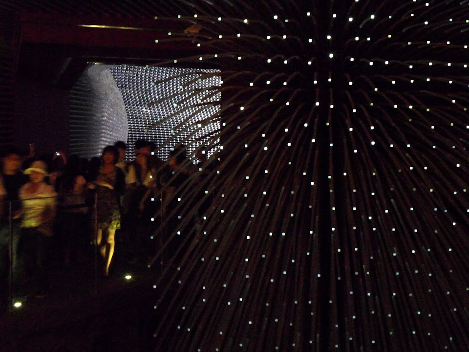 The UK pavilion seemed to be having a power cut, as there were no lights coming from inside or illuminating the queuing area, so people were leaving in droves. We walked in anyway, confident that the combination of British and Chinese staff would get it fixed before we’d managed to get past the rapidly dwindling queue. Rather than the usual 6 hour queue we waited all of 12 minutes before the lights came back on and we entered into what’s been dubbed the Seed Cathedral. It’s a cube made up of 60,000 fibre optics, all containing a different type of seed. These are intended to show how we should try and preserve the world’s plant life – I’m not sure how this is in keeping with the Expo’s theme of ‘Better City, Better Life’ but beautiful and impressive nonetheless.
